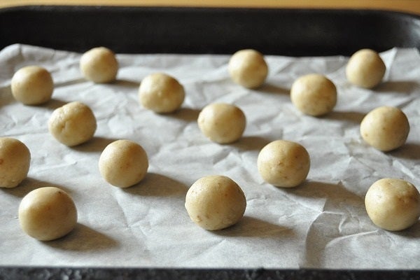 3、オーブンは170℃に予熱する。天板にオーブンシートを敷き、(2)を14等分(1個10g)に丸めて並べ、予熱したオーブンで14分焼く。