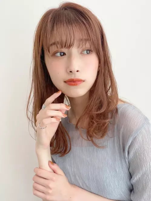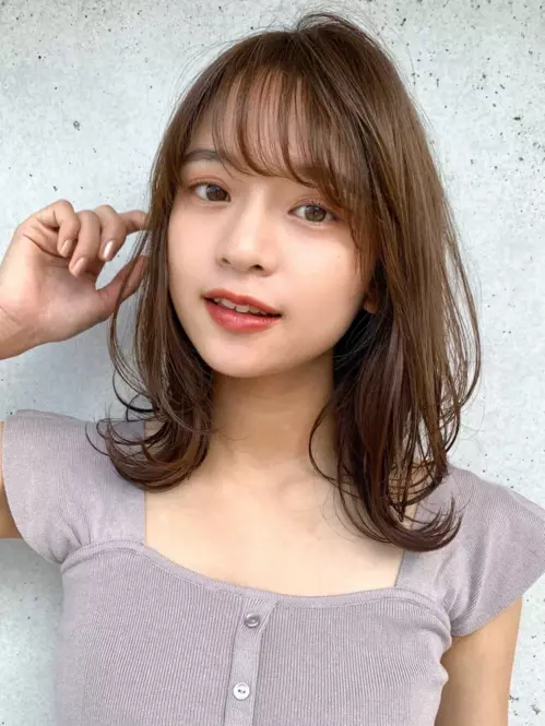 柔らかい質感に仕上げた、大人可愛いミディアムスタイルです。レイヤーと毛先パーマで、思わず触れたくなるような柔らかい質感に。やや明るめの透明感カラーもポイントです。