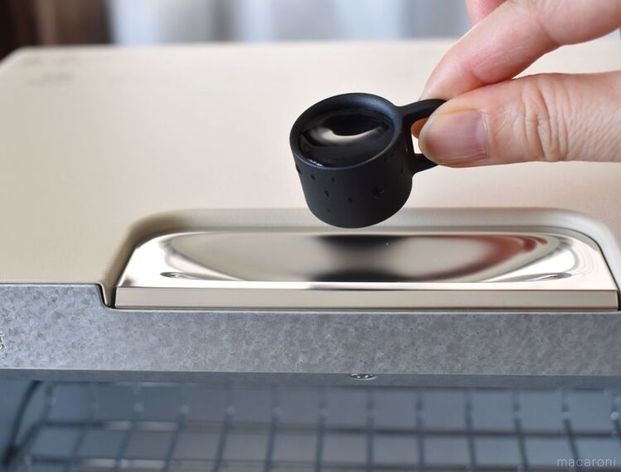 次は旧タイプから変わらない、大切なステップ!トースター上部の給水口に、付属の小さなカップ(容量5cc)で水を注ぎ入れます。使うたびに毎回1杯の水を投入するところが、バルミューダならではの手順ですね。