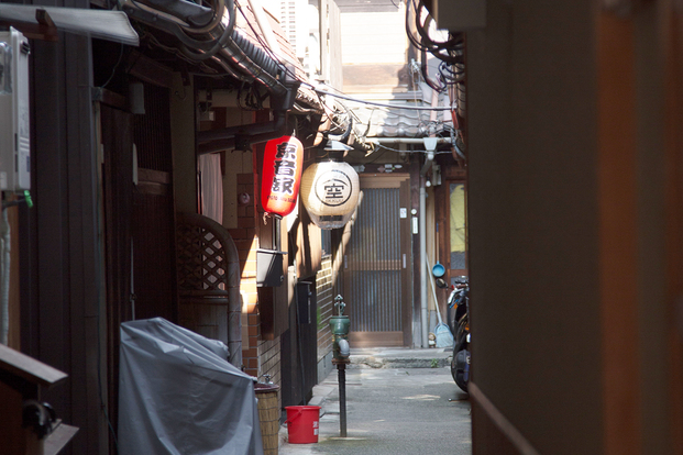 カフェ利用はビジターも可。2階よりフロントと共用スペース、客室となる。「烏丸御池」駅から徒歩6分。