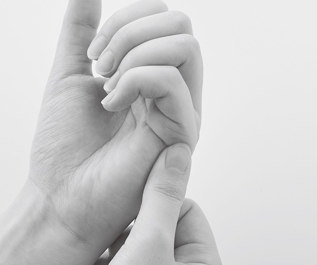 手のひらの手首付近「手根のエリア」をもみほぐす。