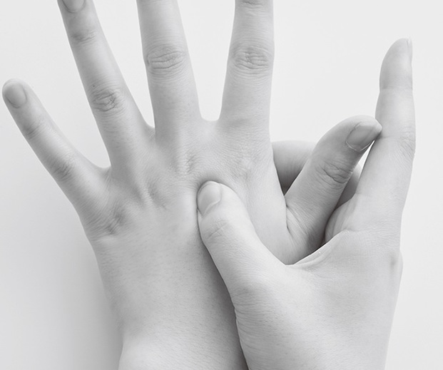 「労宮は自律神経を整える働きがあるツボ。手の指を内側に軽く曲げた時、中指と薬指が触れる間、手のひらのほぼ真ん中に位置しています。ここを親指でさすったり、押し揉んだり、やさしく刺激してあげることで、緊張感やそわそわ、不安感が和らいでいきます」