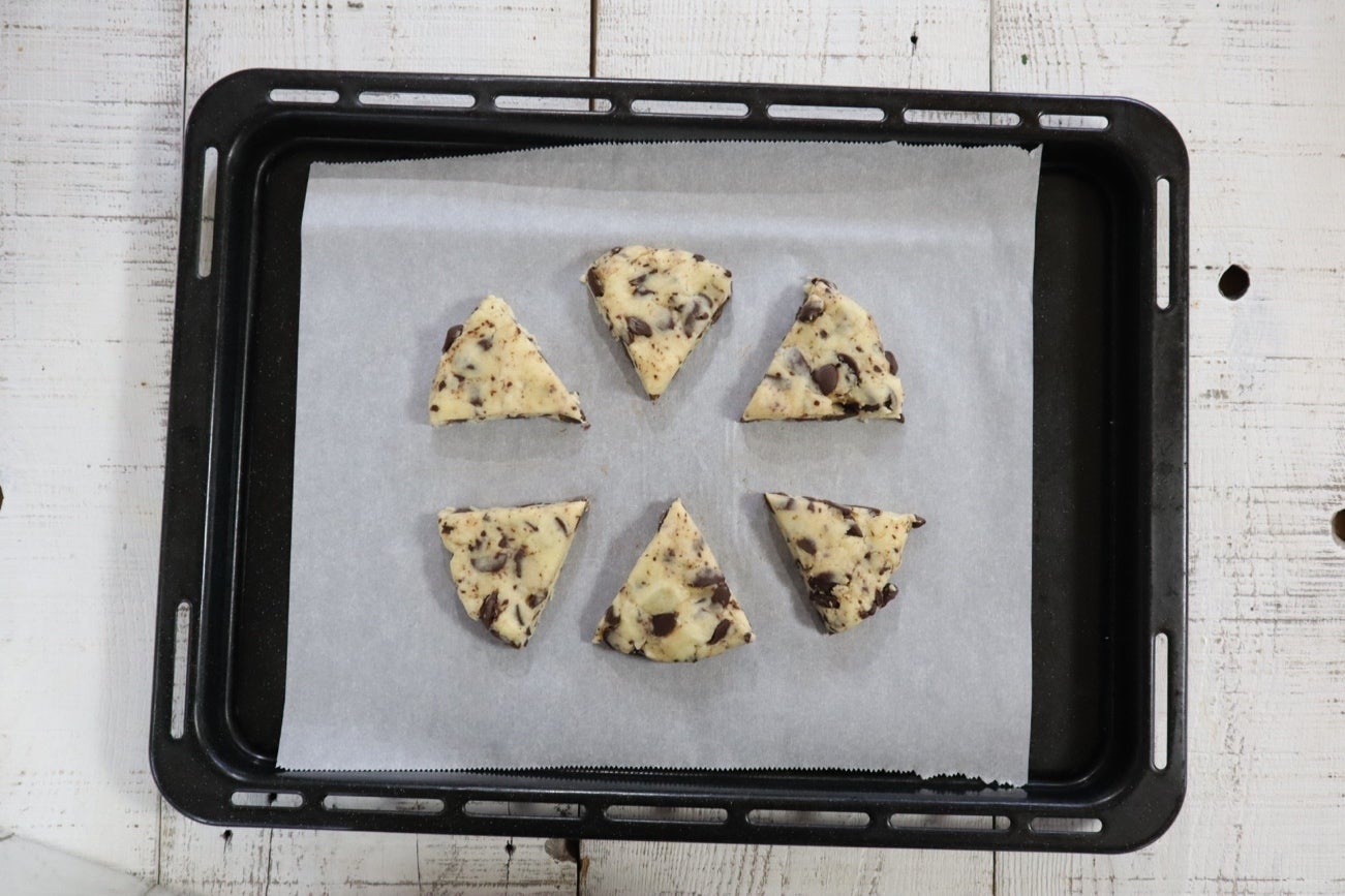 ② 天板にオーブンシートを敷いて、①を直径12cmくらいの円形に成型して乗せて、スケッパーや包丁で放射状に6等分にカットして、間隔を空けて並べます。予熱が完了したオーブンに入れて、うっすら焼き色が付くまで12〜15分焼成します。