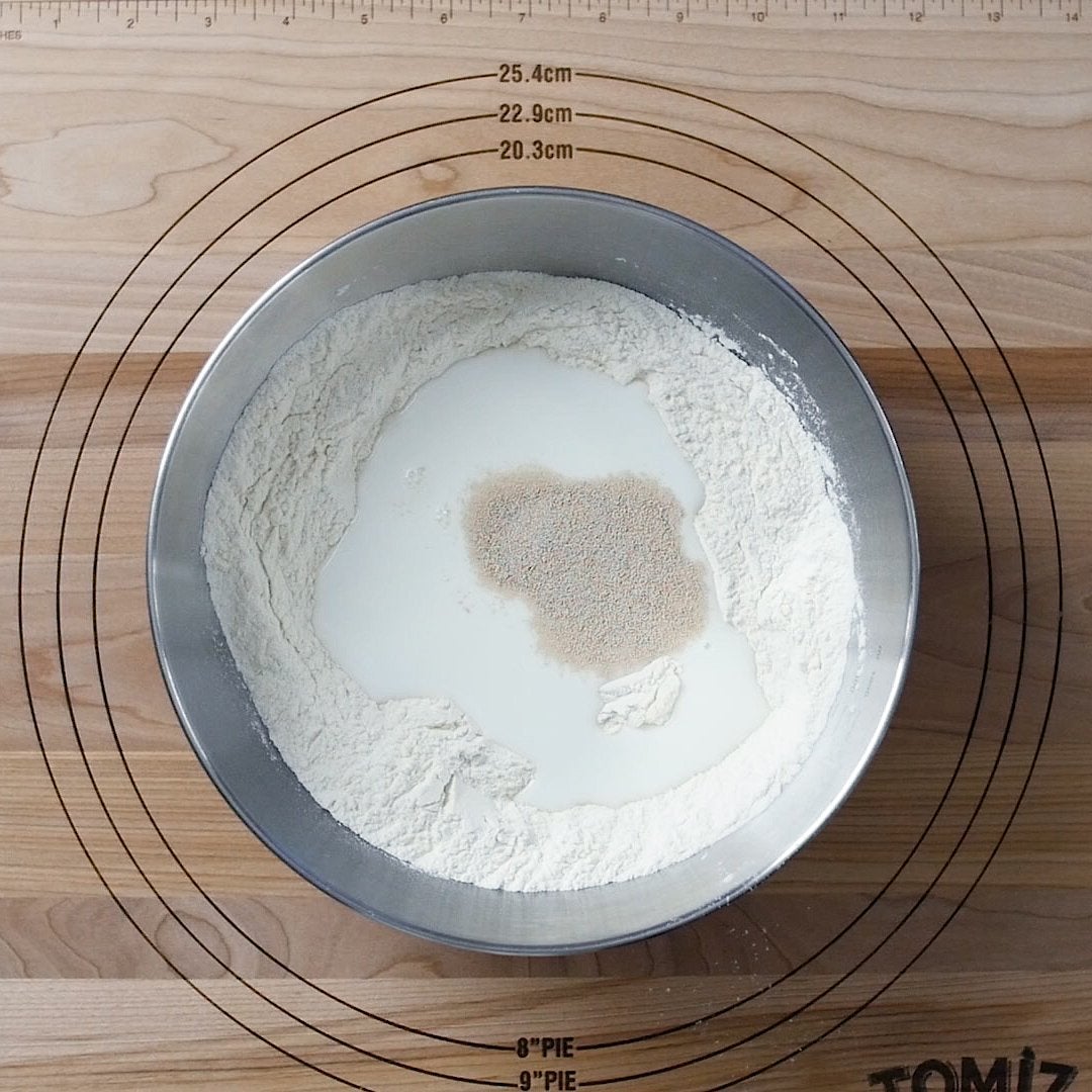 真ん中にくぼみを作り、牛乳、練乳、イーストを入れよく混ぜます。