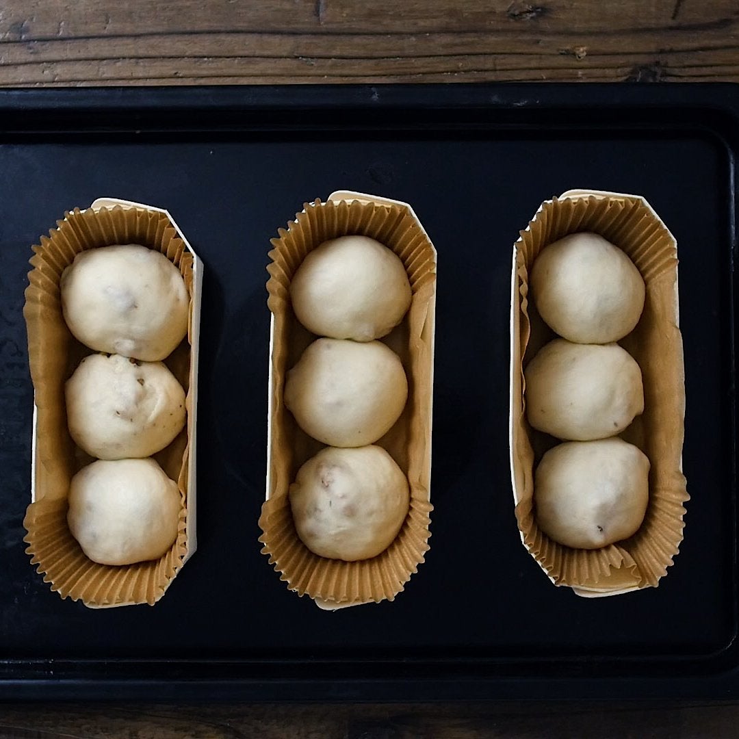 丸め直してとじ目を下にして3個ずつ型に入れます。