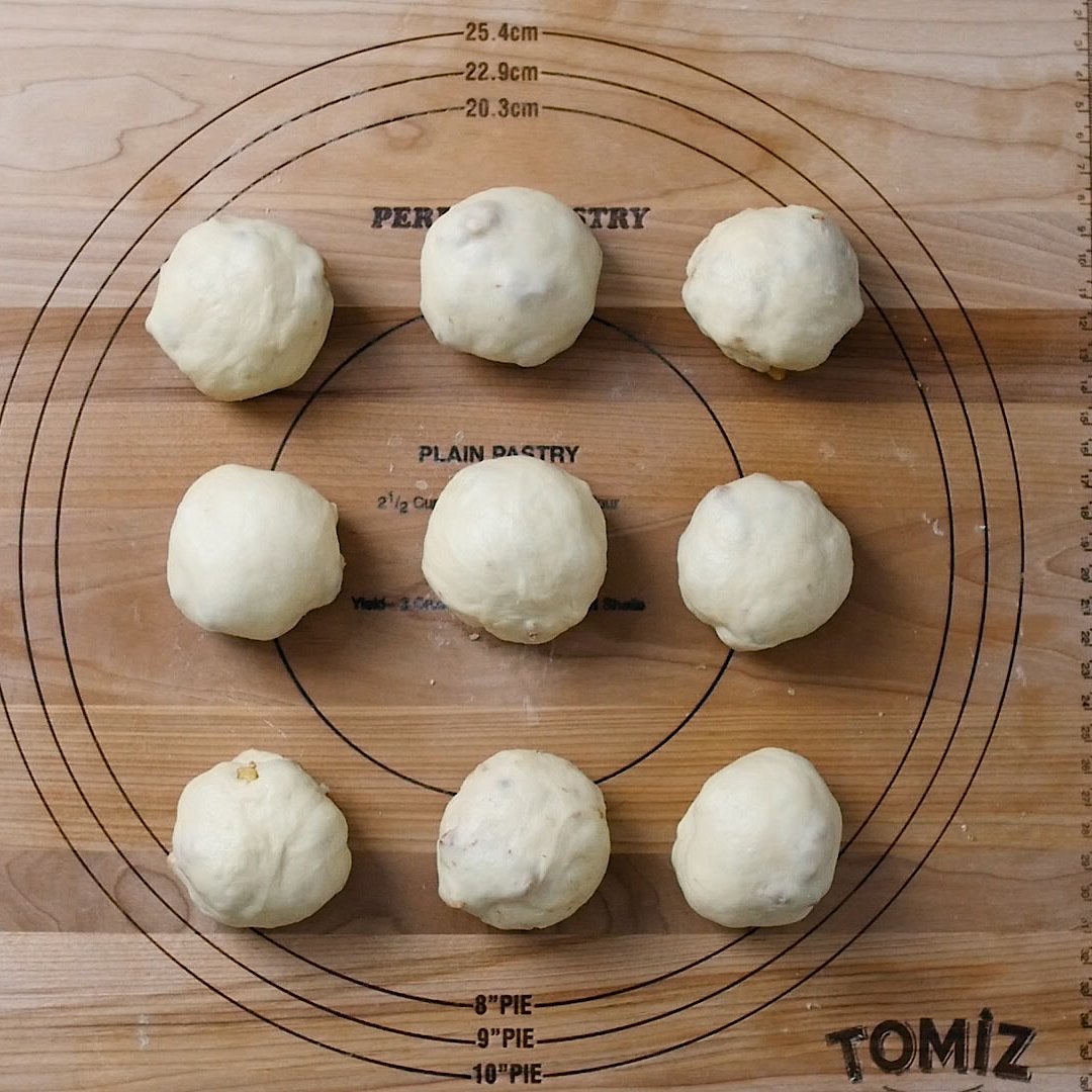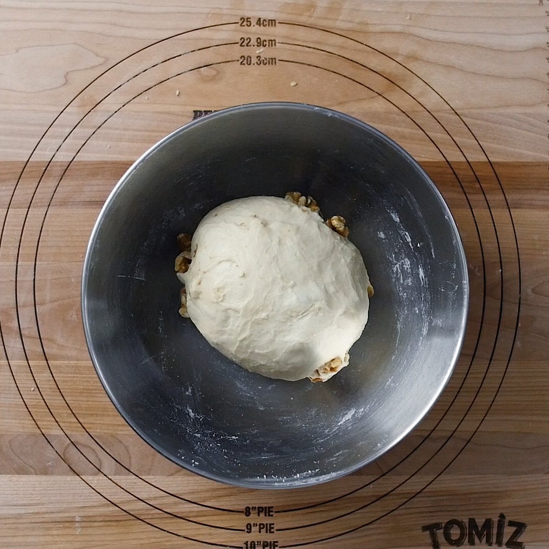 捏ね板の上でなめらかになるまで捏ねます。捏ね上がった生地にクルミをざっくりと混ぜ込みます。