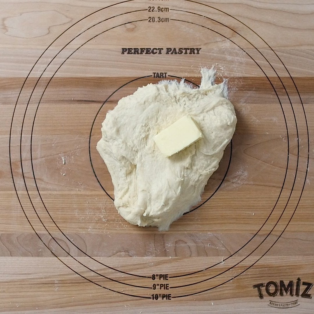 台の上に出して捏ね板の上でなめらかになるまで捏ねます。生地とバターを混ぜ合わせます。