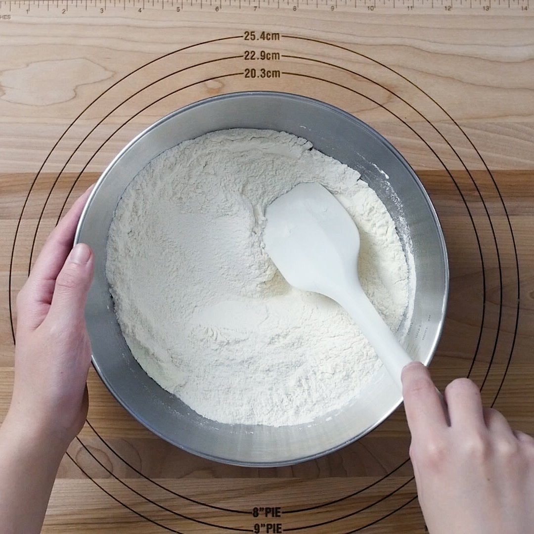 ボウルに最強力粉、塩、グラニュー糖、スキムミルクを入れゴムべらで混ぜ合わせます。