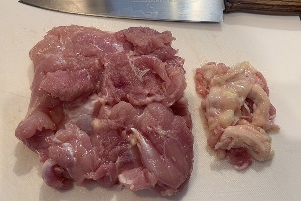 何のためにこんなことをしているのかと言いますと、鶏もも肉1枚に必ずある「脂スポット」を探して欲しいからなのです。鶏もも肉は意外と脂が多い。しかも牛や豚に比べてコレステロール値が高く、できれば取り除いて欲しい。地鶏は運動量が多いので不要な脂も少なく、香りも良いのですが、通常の鶏もも肉は集団飼育なために運動量が極端に少ない。不健康な脂であり香りも良くない。唐揚げや煮物、ソテー、カレーにシチューにと、リーズナブルで大活躍の鶏もも肉なので「脂スポット」を覚えて、いつもの「鶏料理」をより美味しく健康に食べてくださいね。