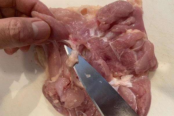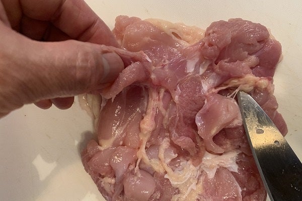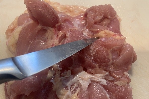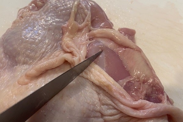・次は少し厄介です。おつまみ君の反対サイドに、肉に身を隠した「恥ずかしがり屋な脂ちゃん」がいます。容赦無く肉をめくって曝け出してください。ここはまさに「スポット」的に溝に潜り込んでいます。上手に取り除くポイントは、肉を指で軽く引っ張りながら、その反対方向に向かって包丁の先で、肉から脂身を「押し出す&かき出す」的なイメージで。慣れないと少し手間取りますが、これでぐーんとカロリーが下がります。