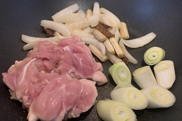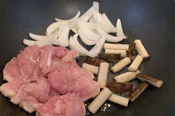 1.フライパンに「サラダ油」大さじ1を入れ中火で温める。なるべく常温に戻した「鶏もも肉」を、皮を下にして焼く。下味はしない。はじめにお肉の真ん中から外側に向かってフライパンに押し付けてあげると、皮が均一に広がりパリッっと焼ける。「玉ネギ」も「ゴボウ」も投入。火の入りにくい食材から焼いていく。ここから3分ほど焼くので、時々「玉ネギ」と「ゴボウ」を混ぜながら、この間に「おにぎり海苔」を炙る。