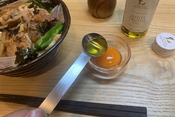 9.そして本日も登場!「白トリュフオイル」キャップを開けた途端、豊潤な香りが漂います。「卵黄の器」に小さじ1杯入れてください。お好きな方はもう少し。かなりリッチに傾きます。どんぶりと一緒に食卓へ出し、食べる直前に丼の中央へ流し入れます。最後にお好みで七味をふりかけます。
