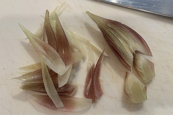 ・「ミョウガ」。縦に半分に。下を三角に切り落とす。ここは刻んで納豆や味噌汁に。残った大きい方は外側から手でめくりバラします。大きいものは縦半分ほどにカット。