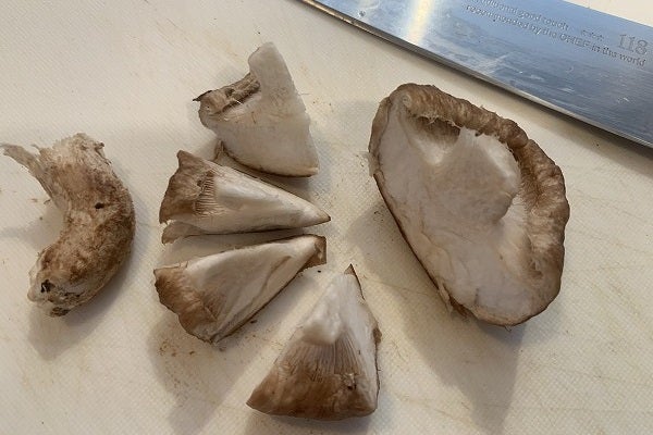 ・「シイタケ」。石付きを切り落とす。足が長ければ適当なところで切り落とす。スライスせずに8等分に。