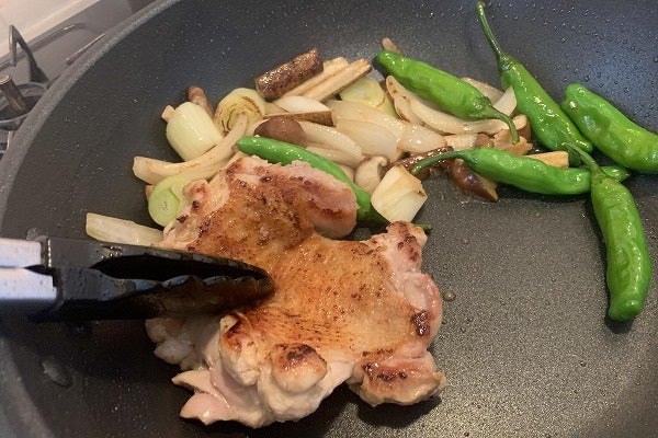 ときどき「鶏もも肉」をトングで抑え、フライパンをぐるっと一周させてあげると、滲み出た鶏脂が野菜達によくまわり、よい焼け具合に。コクも増します。