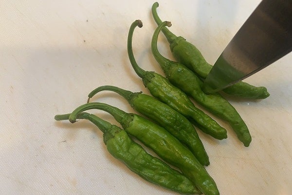 ・「シシトウ」。まな板に転がし「包丁の先」で1ヶ所ずつ刺していく。おわり。