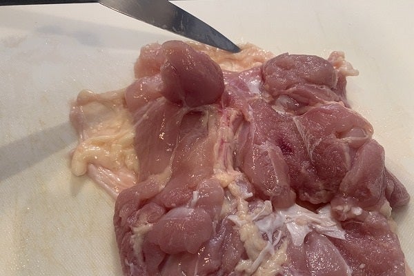 包丁の角度を45°ほどに寝かせて、肉とスジ&脂身の境目を先端でこそぐと割と簡単に取れます。