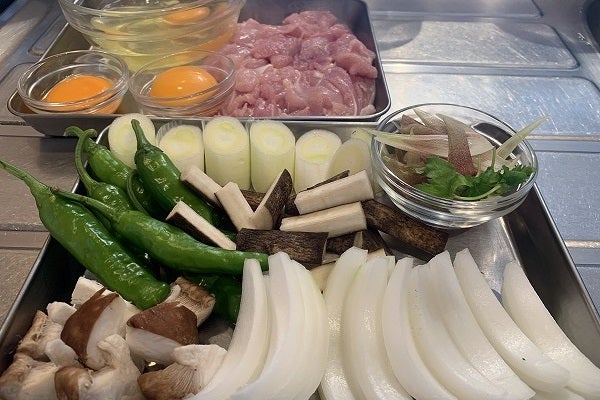 ※今回のテフロンフライパンは28cmの深いタイプ。「鶏モモ」は焼く時にどうしても脂が跳ねるので、できれば深型を。道具としては有れば「小さめのバット」が2枚、調味料用と卵用の容器が4つ。そろえると便利ですがありものでも十分です。器は小どんぶりです。ワインと一緒に楽しんでもらいたいので、具材多めでお米は少なめにしました。〆にしたらちょっとな時もちょうど良いかもです。しっかり召し上がりたい時はお米を増やしてくださね。