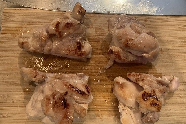 ※少々おふざけが過ぎましたが、今回の下準備のポイントは「健康的な鶏もも肉の処理」でした。全部で5箇所。上手に取れましたか?少々厄介ですが、「鶏もも肉」は使用頻度も高いと思うので、少し意識してみてくださいね。健康と包丁の先にはくれぐれも気をつけて!下準備20分。