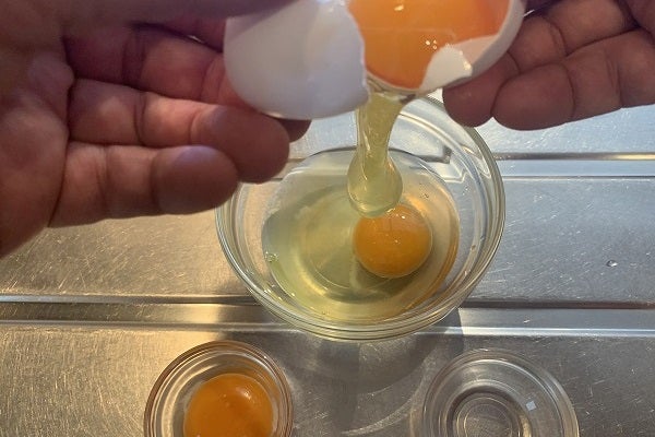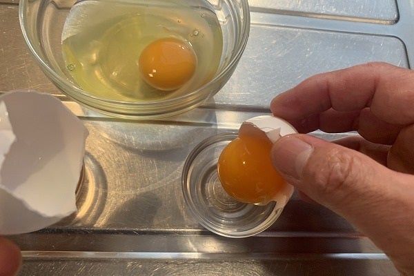 ・お次は「卵」。「全卵」が2個分入る大きめの容器を1つ、「黄身」が1つ入る容器を2つ用意する。