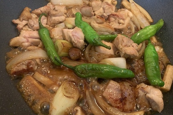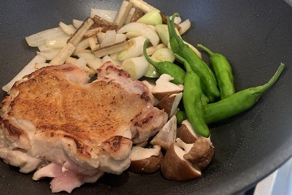 2.「鶏モモ肉」の皮が少し色づき脂が出て来る。「ゴボウ」の角も色づいてきたら、「白ネギ」と「シシトウ」、「シイタケ」も投入。ここから2分ほど焼く。