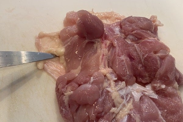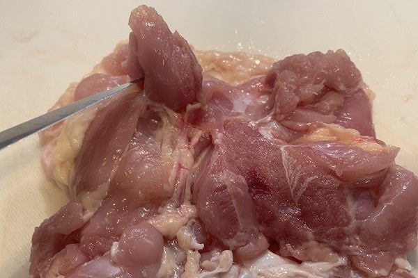 ・まずすぐ横に、「白いスジ」が縦に1本あります。周りに油もついているので取り除きましょう。スジと肉の間に「包丁の先」を入れ隙間をつくります。「おつまみ君」から手を離しその隙間に指を入れスジを真上に引っ張ります。するとほとんど肉から引き剥がせると思います。