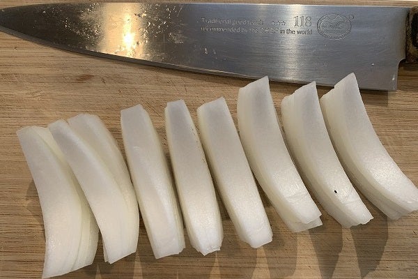 こうする理由は他の具材と大きさを揃えて(1)加熱時間を合わせる(2)食感を合わせる(3)盛り付けの見栄えをよくする(4)真ん中を他の料理で都合よく使える、など。芯を残したままで、くし切りやスライスにすると、真ん中の一番小さな部分が「小さなカケラ」になるから。それは加熱時に先に焦げていくし、煮込み時に先に溶けていきます。自分でもちょっと変わってると思いますが試してみて下さい。いずれ「仕込みシリーズ」で詳しく!