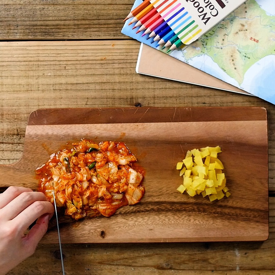 キムチ、たくあんは細かく刻みます。