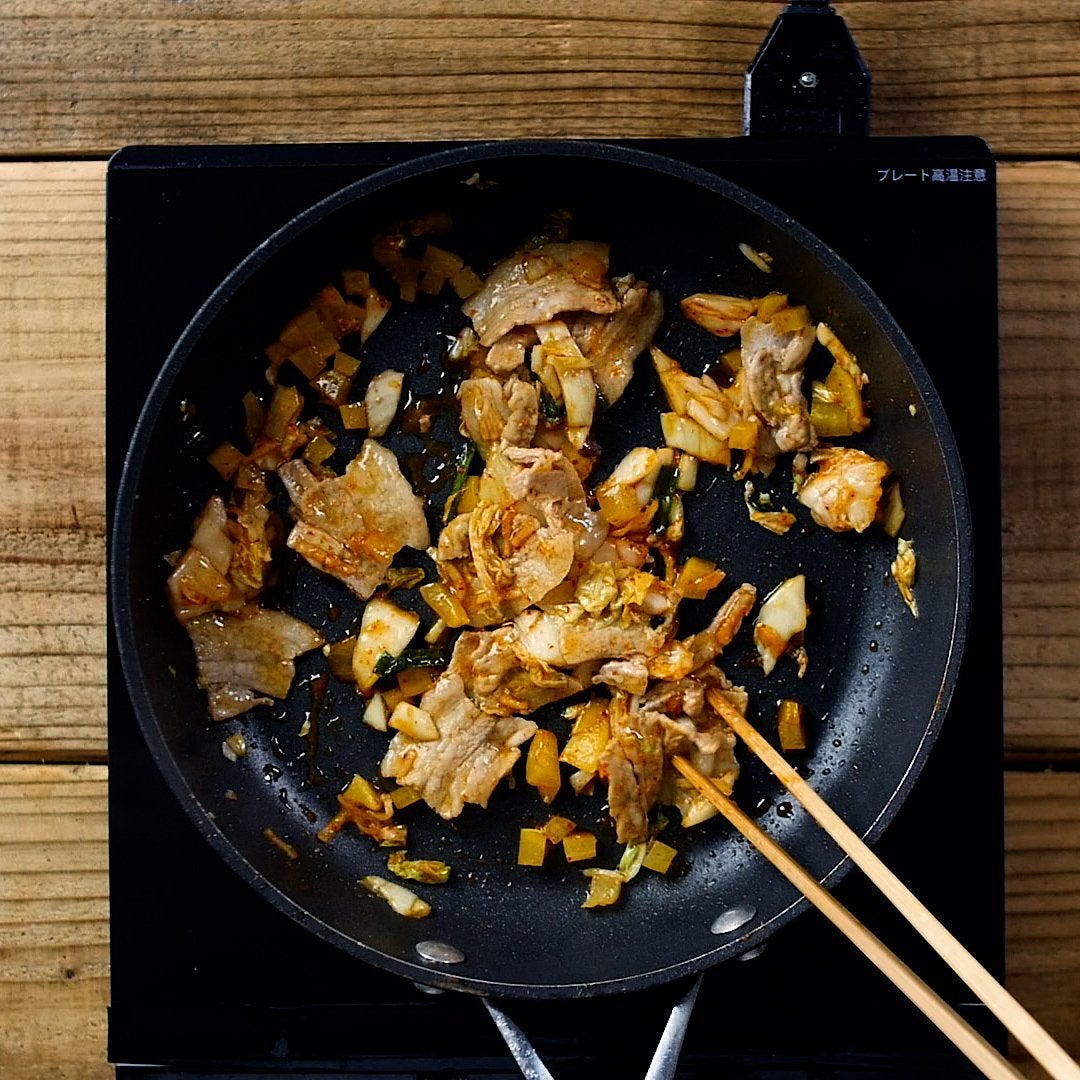 フライパンにごま油を引いて熱し、豚バラ肉を入れて色が変わるまで中火で炒めます。