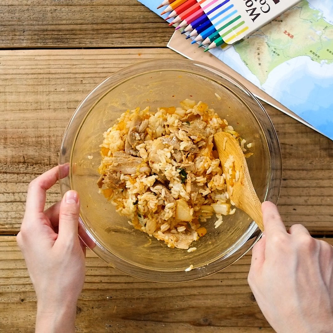 ボウルに入った温かいごはんと混ぜ合わせます。
