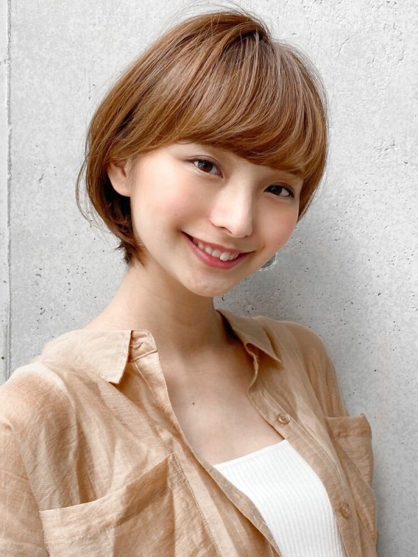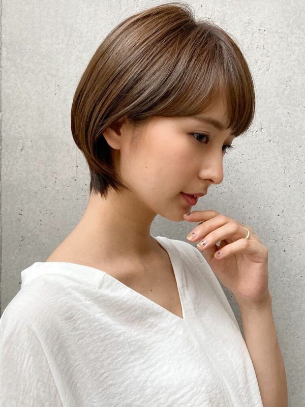 シンプルな丸みショートの洗練されたミニマムさが、人気の明るめベージュの髪色と相まって大人可愛い印象です。