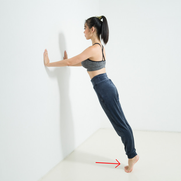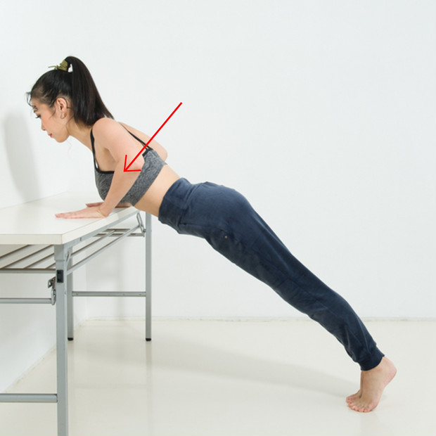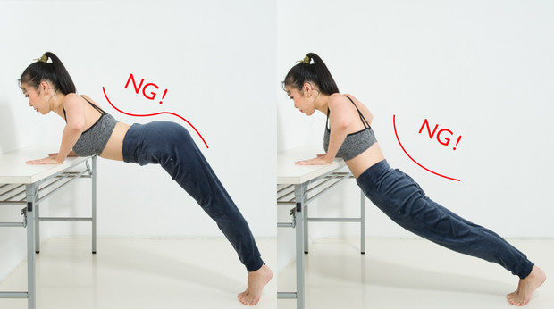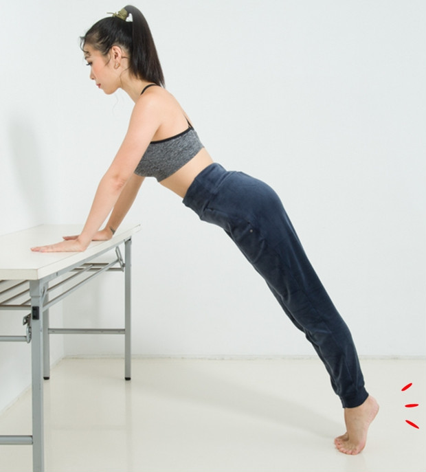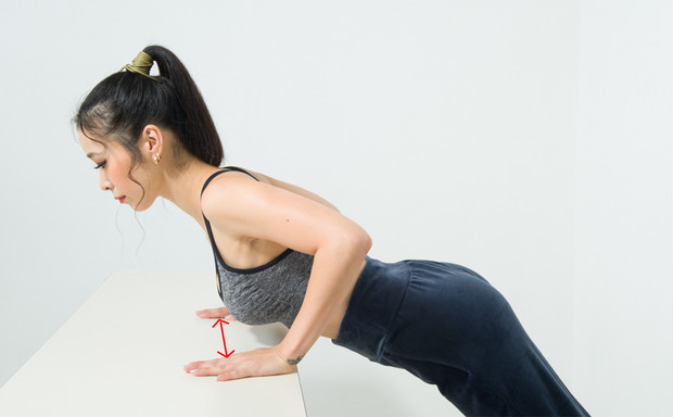 肩幅よりも少し広めにテーブルに手をつく。背中から脚まで一直線になるように足を引き、足はつま先立ちに。