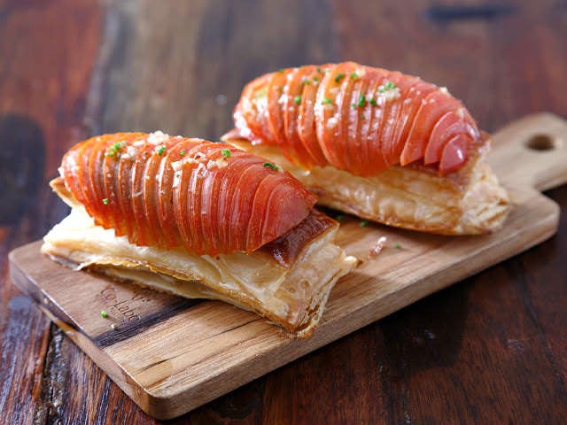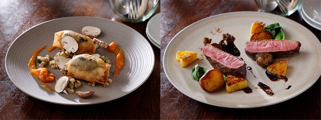 さらに、「ビュルゴー家シャラン鴨胸肉のロティ インカのめざめとパイナップルのロティ、五香粉バルサミコソース」(写真上・右)も、フルーツのアクセントが楽しい一品だ。