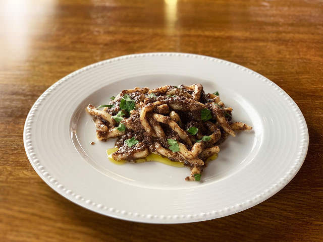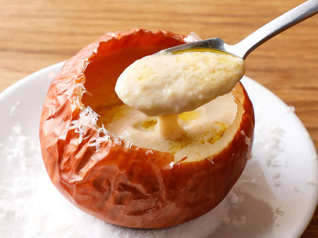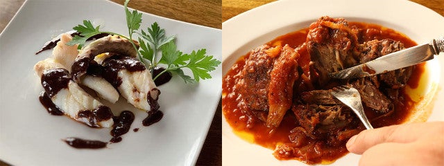 ローマの郷土料理「コーダ・アッラ・ヴァチナーラ(牛テールの煮込み)」(写真上・右)は、モモやフィレなどがメインの宮廷料理に対して、安い部位をいかにおいしく食べるかを研究した末に生まれた家庭料理。牛骨から溶け出すうまみに香味野菜の甘みが加わり、なんとも奥深い味に仕上がっている。