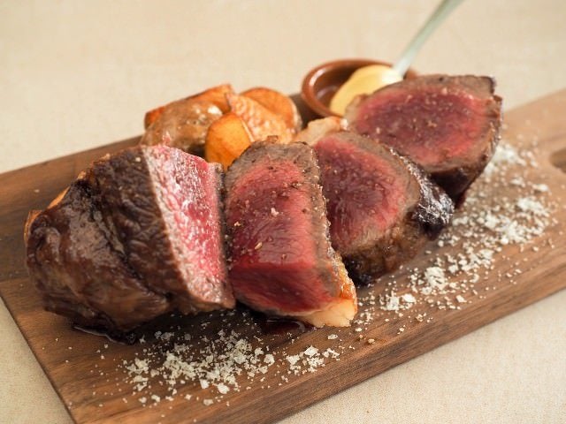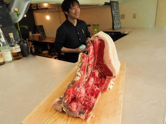 同店のメニューは、シャルキュトリー(肉の惣菜)、サラダ、ステーキ、パスタで構成。まず、お客に肉の塊を見せて、どのくらい肉を食べられるかを教えてもらったら、その後、肉以外のメニューを決定する。これはずばり、「肉をおいしく食べてもらうため」の工程だ。肉は、一流店からも定評のある希少熟成肉専門卸・北海道の『エレゾ』、滋賀県の『サカエヤ』などから、ステーキにちょうどよい30日前後の熟成具合のものを取り寄せている。