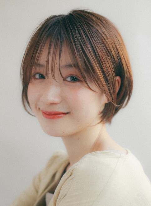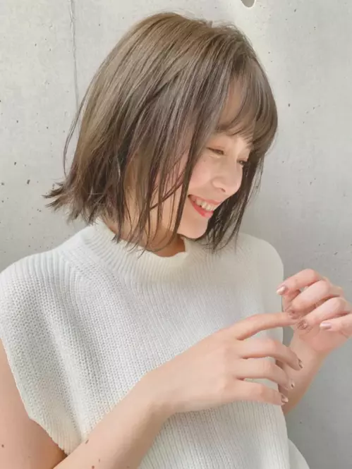 ひし形シルエットでくびれを作ることによって、小顔効果抜群の丸みショートボブ。毛先を軽くして動きが出るようにカットすることで、ラフな質感が生まれます。乾かすだけでまとまるからスタイリングも簡単。