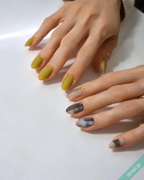 アクセントになったネイビーのマットカラーが全体を引き締めてくれている、秋冬らしい大人のカジュアルネイルですね!