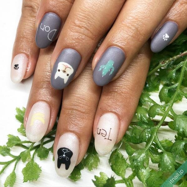 次にご紹介するのは、それぞれの指に異なるアートを施したお洒落なマットネイルです。