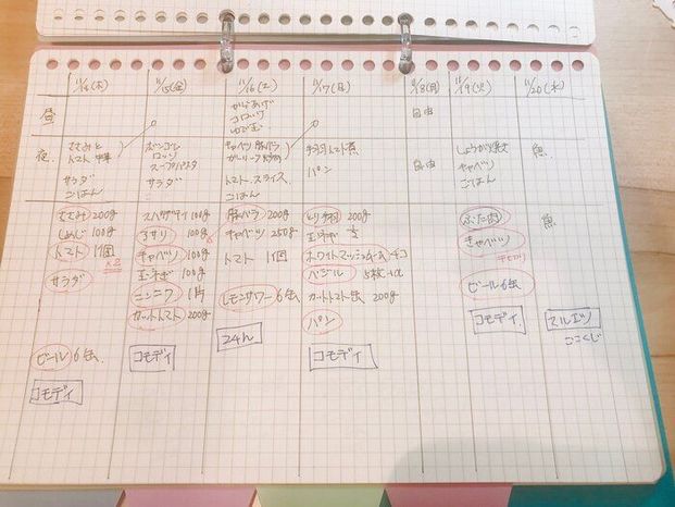 そこで、1週間分のメニューをある程度決めてメニュー表を作成。買い物は2〜3日に1回ペースで仕事帰りにスーパーに行っています。必要なものだけ買って帰り、決めたメニューでつくることにしました。
