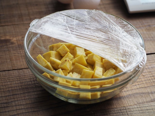 ③ さつまいもを耐熱容器に入れ、電子レンジ600wで2分半から3分または柔らかくなるまで加熱する。
