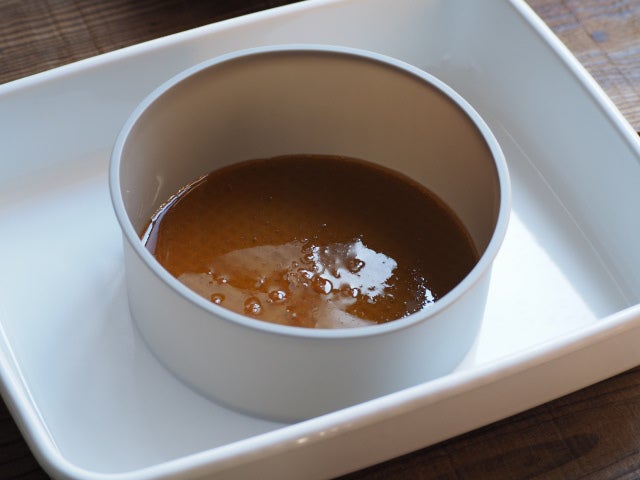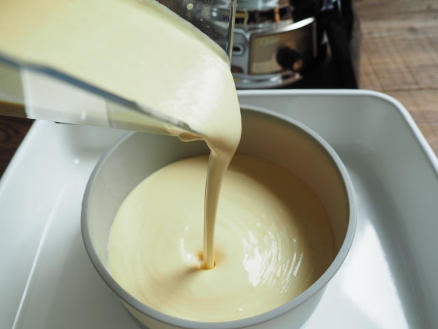 ⑧ ⑥をバットやオーブンの天坂に置き、⑦の生地を注ぎ入れ、バットまたは天坂に深さ2cmほどになるくらいの水を入れる。