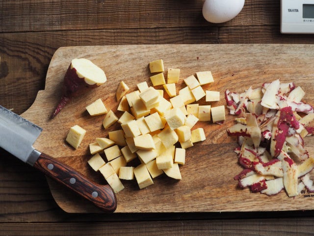 ② 皮をむいたさつまいもを1~2cmほどの角切りにする。