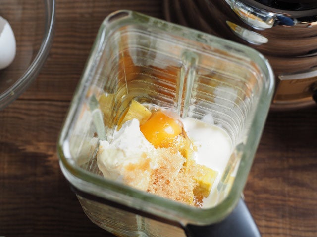 ⑦ ミキサーに③のさつまいもとクリームチーズ、卵、砂糖、生クリーム、牛乳、バニラエクストラクトを入れ、滑らかになるまで撹拌して、生地を作る。
