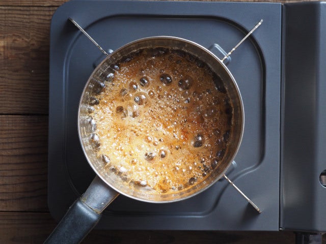 ④ 小鍋に砂糖と水大さじ1を入れたら火を点け、中火で大きな泡が沸々してくるまで加熱する。