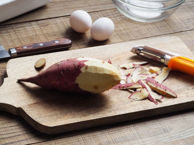 ① さつまいもの皮を、ピーラーや包丁で剥く。