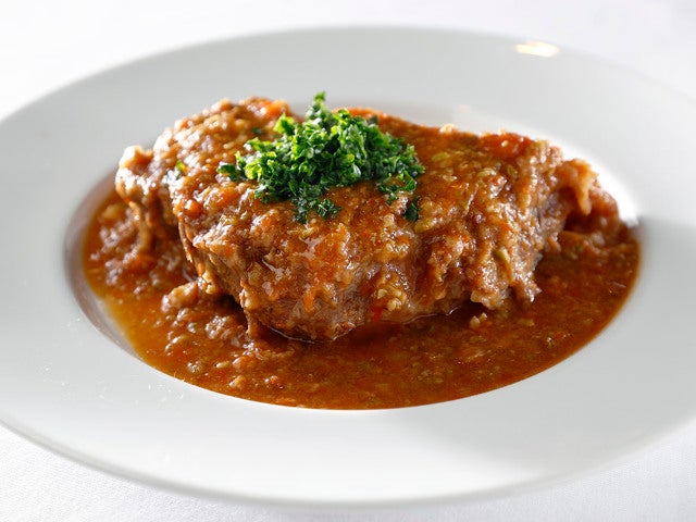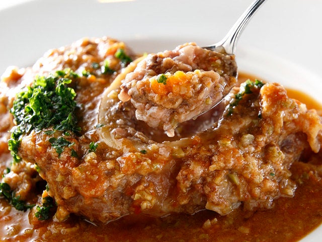 2.5cm程度に輪切りしたすね肉に塩コショウして小麦粉を軽くふった後、オリーブオイルで焼いたら鍋に投入。白ワインとトマトフォンデュ、タマネギやセロリなどをペースト状にしたデュクセルとともに1時間~1時間半ほど煮込んだ後、仕上げに、グリーンオリーブとレモンの皮、レモンの汁を加えたら完成だ。