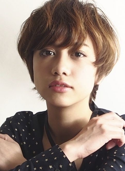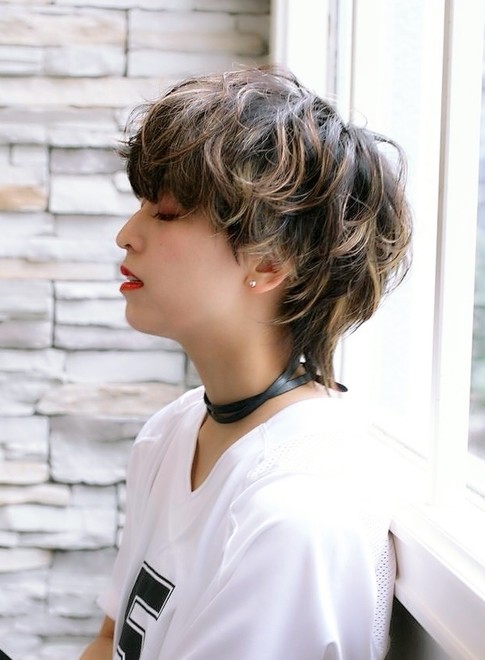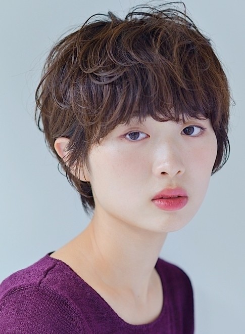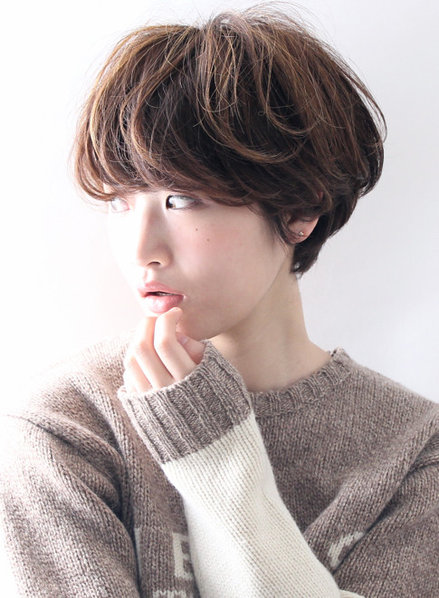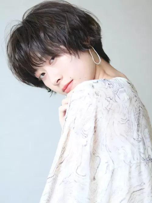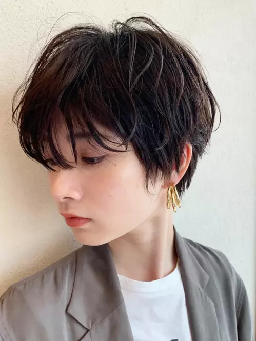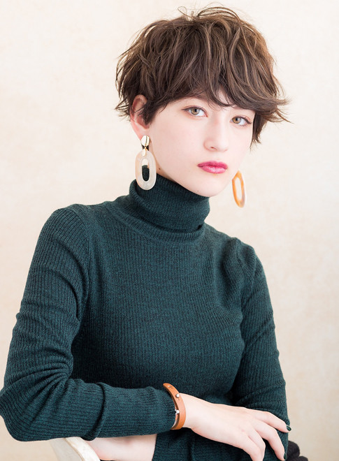 前髪は、深い位置から瞳ギリギリまで長めに残します。顔型をカバーしながらフェイスラインに沿ったラウンドカットでレディ感を演出。ハード系のワックスをトップにクシュクシュともみ込んでスタイリングすれば、丸みのある大人可愛い雰囲気に。