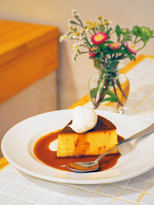プリンはバニラアイスと生クリームがのり、カラメルは甘みより苦みを感じるビターチョコレートのようで印象に残る味です。プリンの提供は土・日曜のみ12:00から。