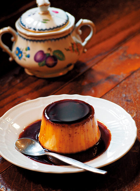 角がピンと立つしっかりとしたプリンは、ビターなカラメルがスポンジにしみてとてもおいしい。プリンが映えるポルトガル製の青いお皿も素敵。プリンはお食事かドリンクとセットで注文が必要です。