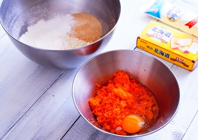 ① にんじんはすりおろして少し水気を絞りボウルに入れて、卵・オリーブオイル・砂糖を入れて、その都度よく混ぜる。
